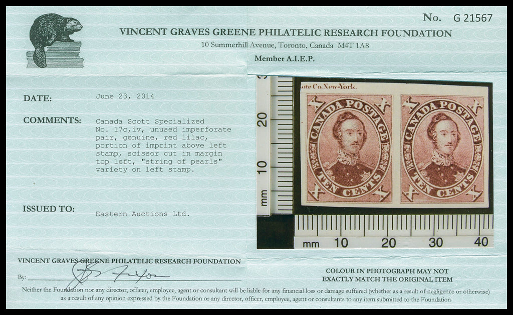 10 Red Lilac - Paire non dentelée, à larges marges, de belle couleur vive, présentant la variété « string of pearls » sur le timbre de gauche, petite coupure aux ciseaux entre le timbre de gauche et l'empreinte de la plaque, pièce UNIQUE provenant de la seule feuille imprimée, VF, certificat Greene Foundation, ex. Brigham.